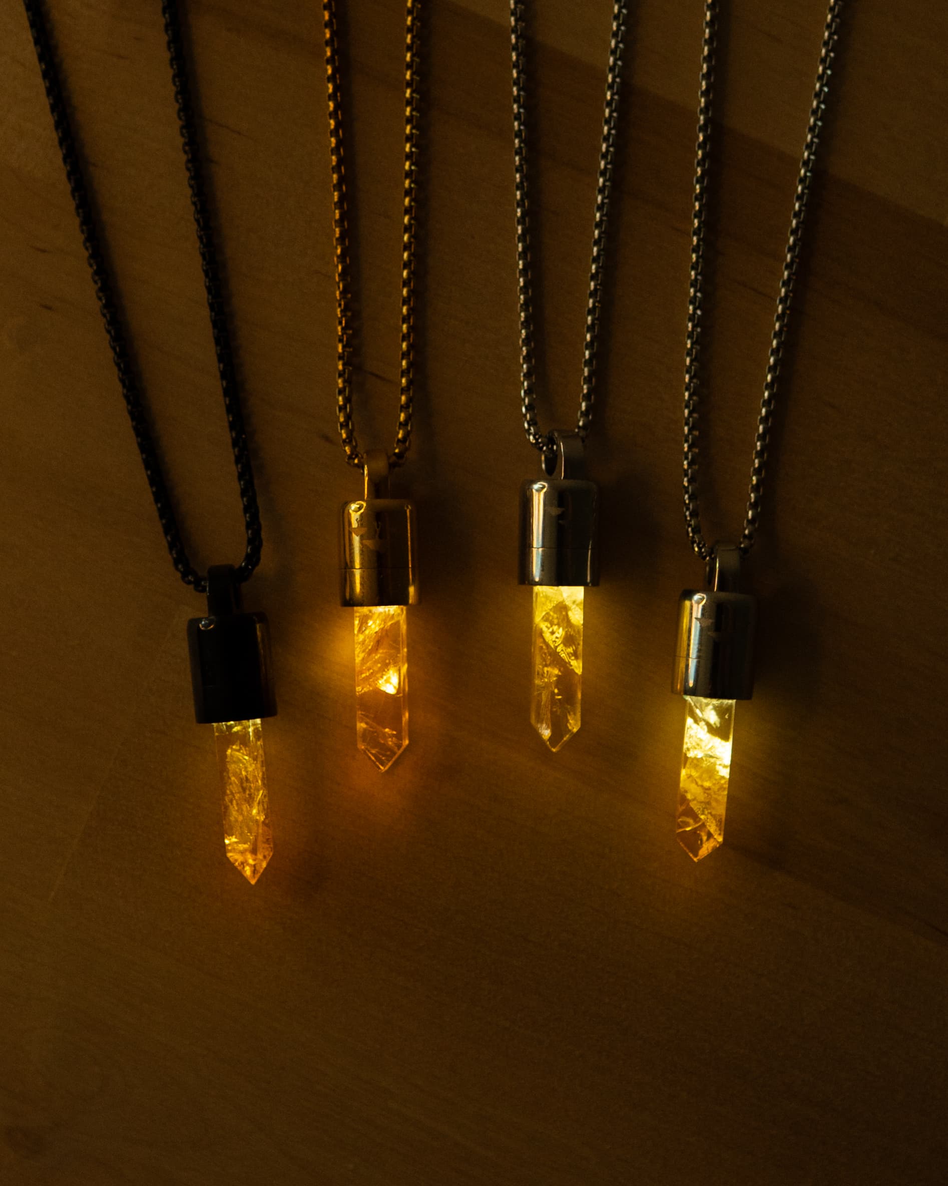 Citrine is a golden variety of quartz formed over millions of years as heat and iron transformed clear crystal into warm tones of amber and gold. A 4–5 K soft-white LED (~6–9 lumens) travels through its facets, creating a bright, sunlit glow. Each piece is chosen for color and clarity, then set in machined 303 stainless steel. Citrine is known for abundance and optimism, and the soft-white light brings out its warm, radiant energy. This necklace will invite good energy into your life — people will ask about it, and the most curious souls are often the most genuine.