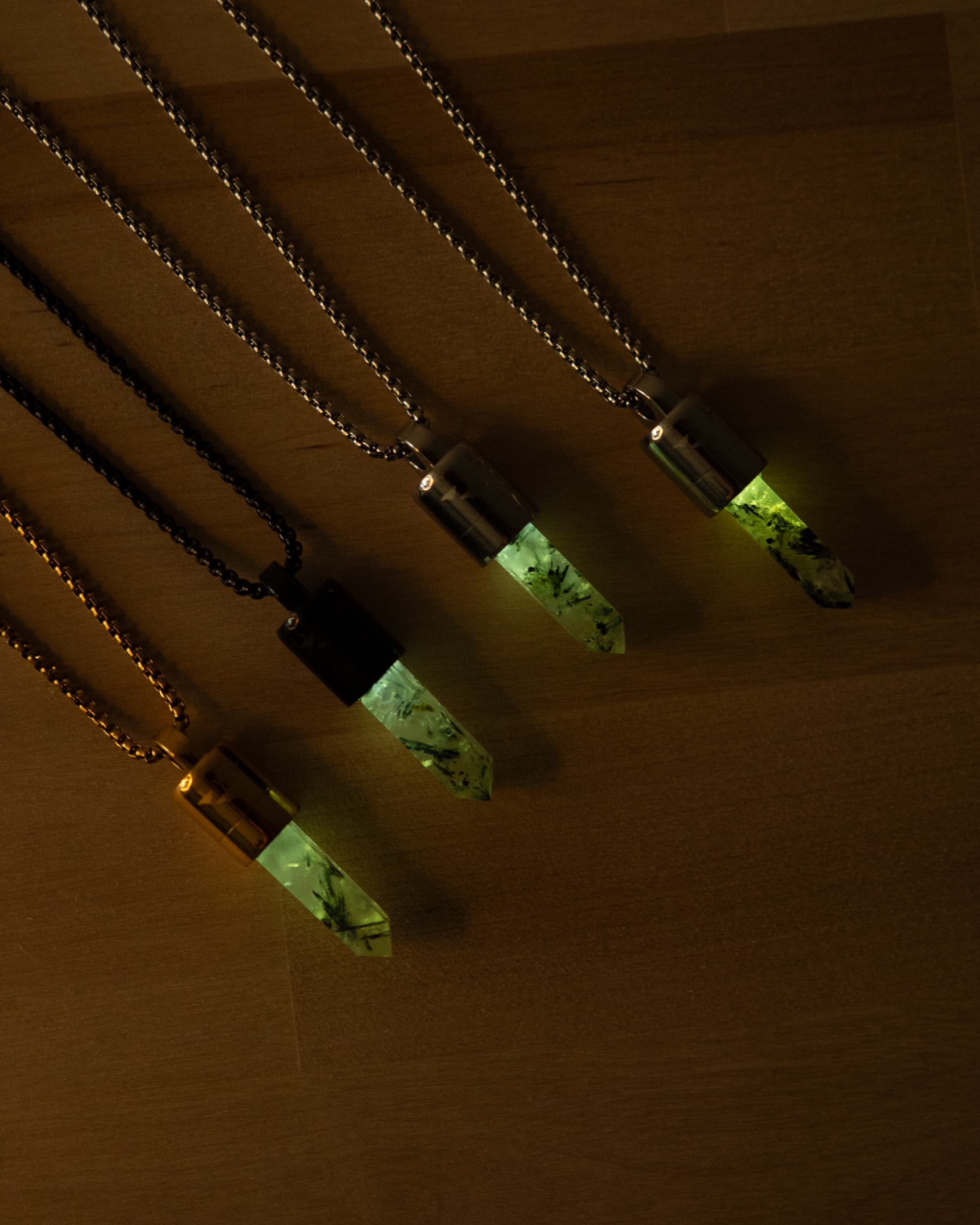 Spire was born from countless experiments with light — exploring how color, warmth, and wavelength interact with natural stone. Every detail was shaped to balance precision and emotion, turning raw stone into something living. The result is a pendant that reveals a fragment of time and space.